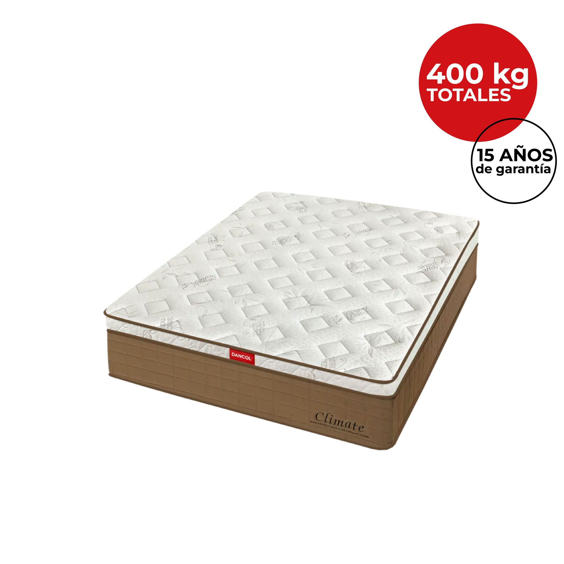 El Climate es un colchón de gran altura perteneciente a la línea Deluxe 2023 de DANCOL®. Está conformado por resortes Multi Pocket encapsulados con tecnología Hard Frame y Cooperwash, lo que multiplica la vida útil del colchón. Posee un soporte total de 400 kg (200 kg por lado).