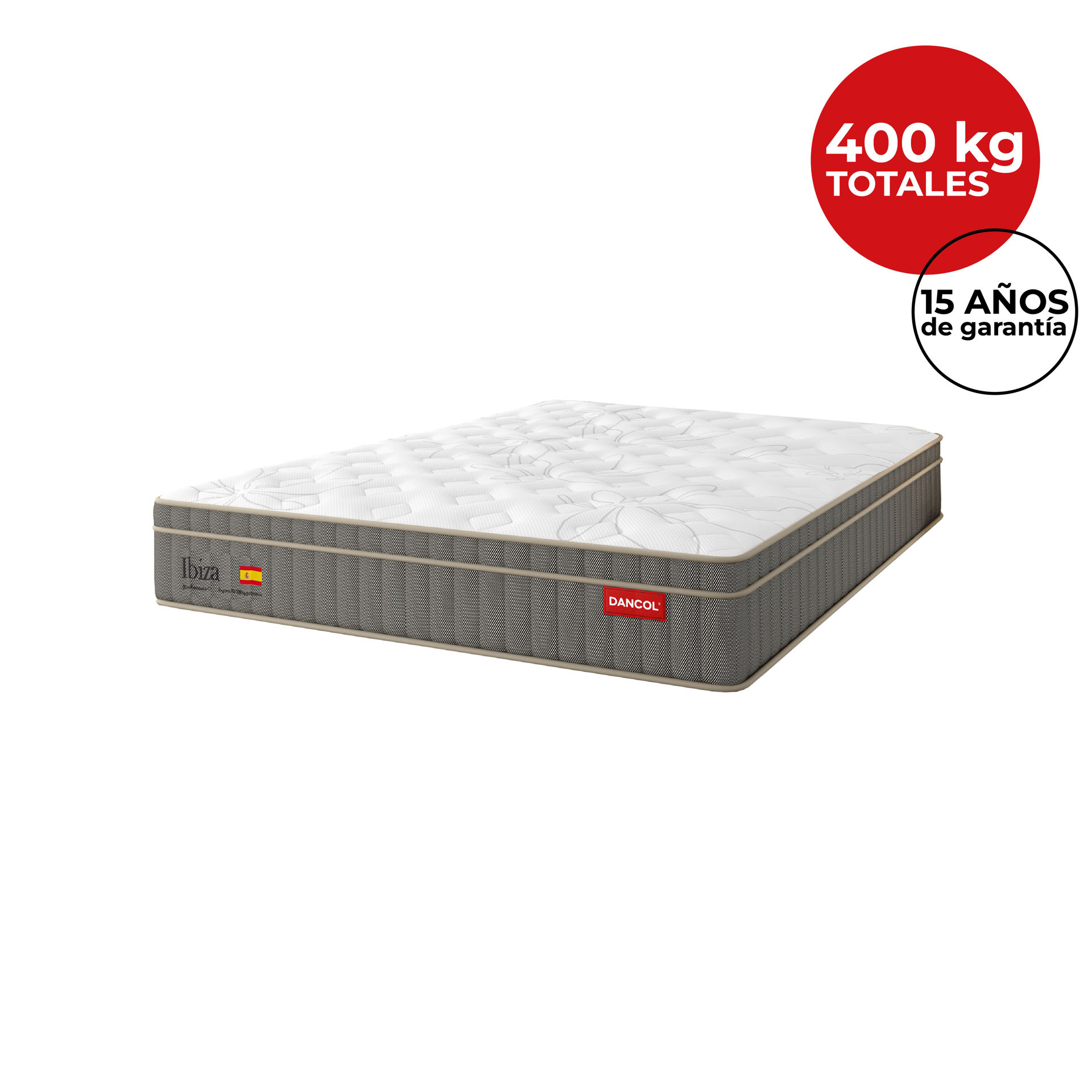 El Ibiza es un colchón de gran comodidad y altura dentro de la exclusiva Línea Deluxe de DANCOL®. Diseñado con resortes Multi Pocket encapsulados y reforzado con tecnología Hard Frame y Cooperwash, este colchón ofrece máxima durabilidad y un soporte equilibrado para un descanso inigualable. Su soporte total es de 400 kg (200 kg por lado) que combinado con un sistema de doble capa de espuma, proporciona un descanso óptimo y ergonómico.